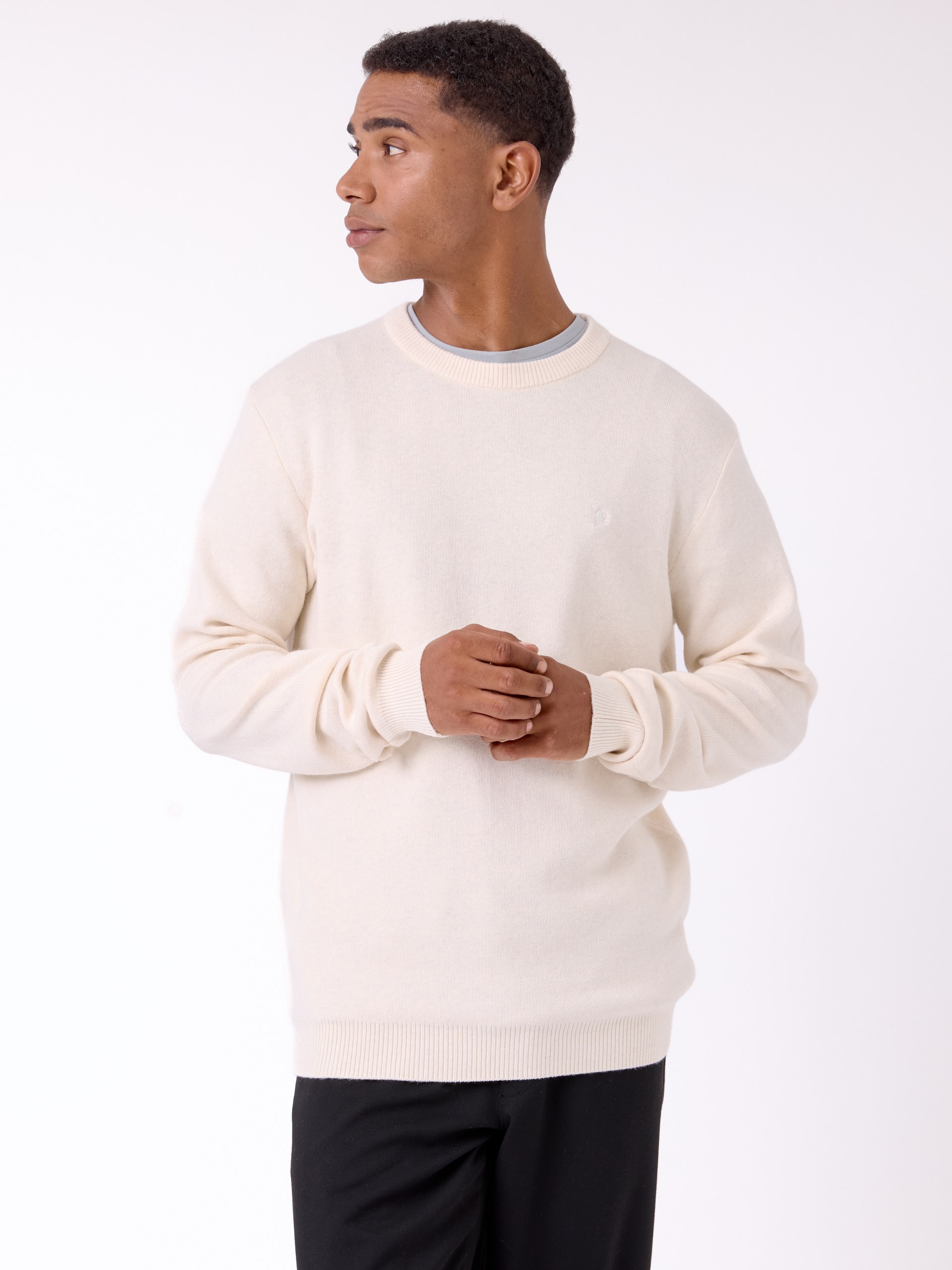 Stilren strikkegenser i behagelig bomull med innslag av nylon og litt ull.