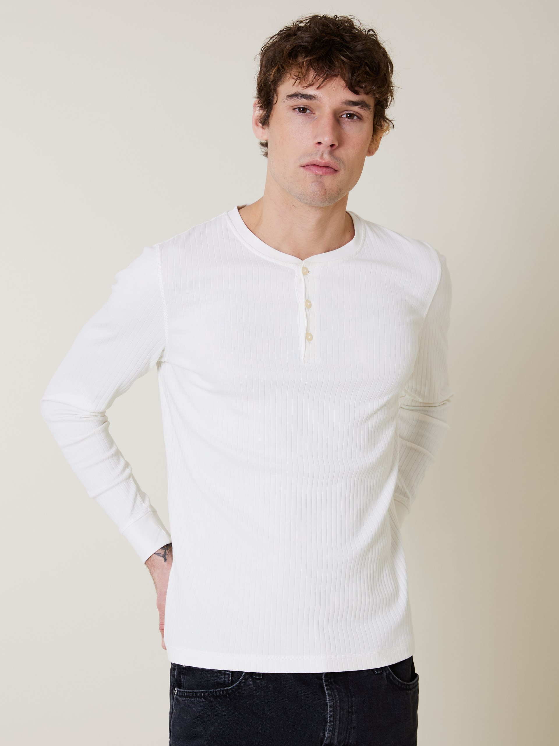 Ribbestrikket grandad i myk bomull med god stretch.