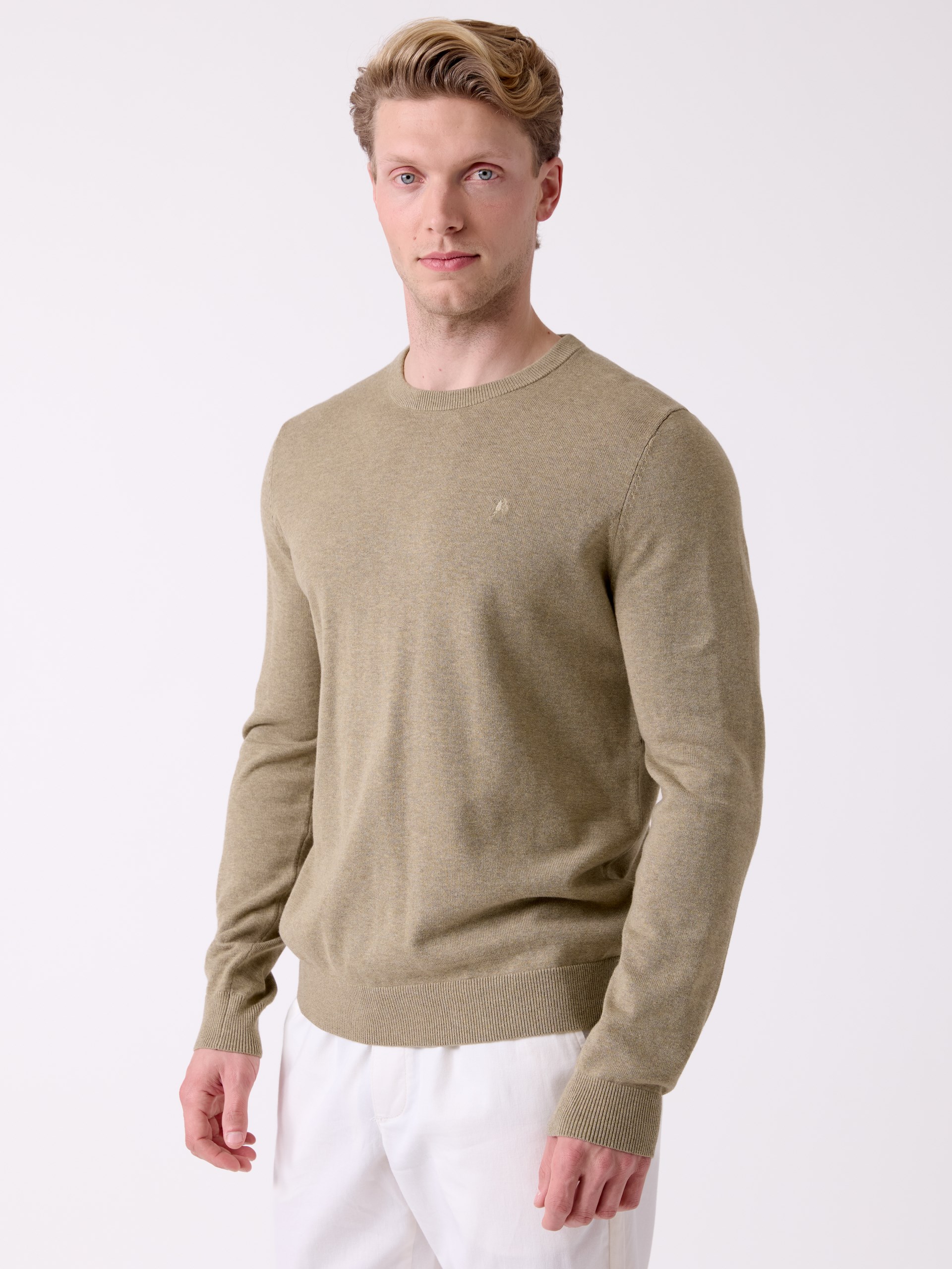 Lett og behagelig genser med melerte garner og vevet stoffdetalj inne i nakken.