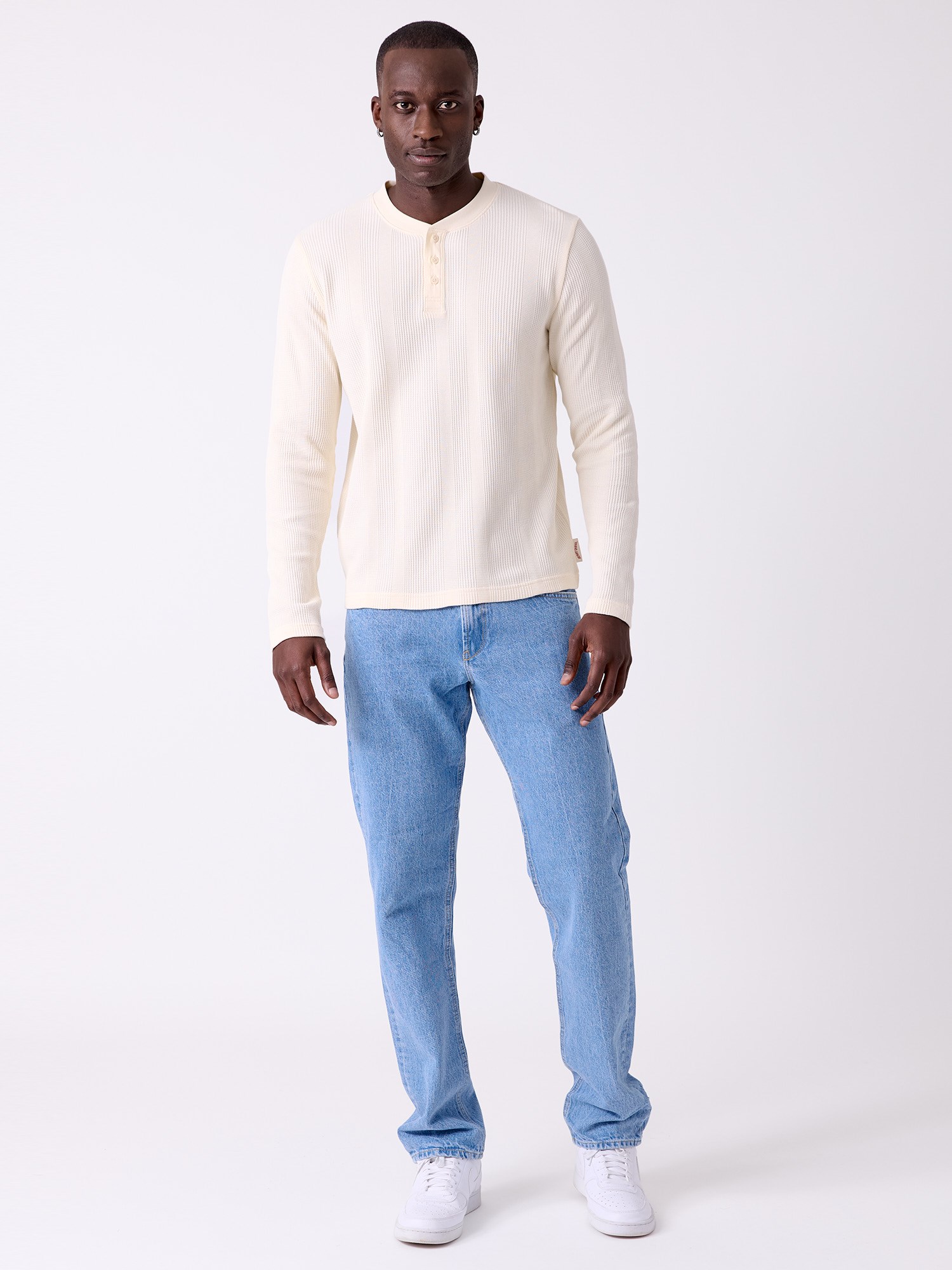 Bestefarstrøye i strukturstrikket bomull med liten ribkrage og knappestolpe