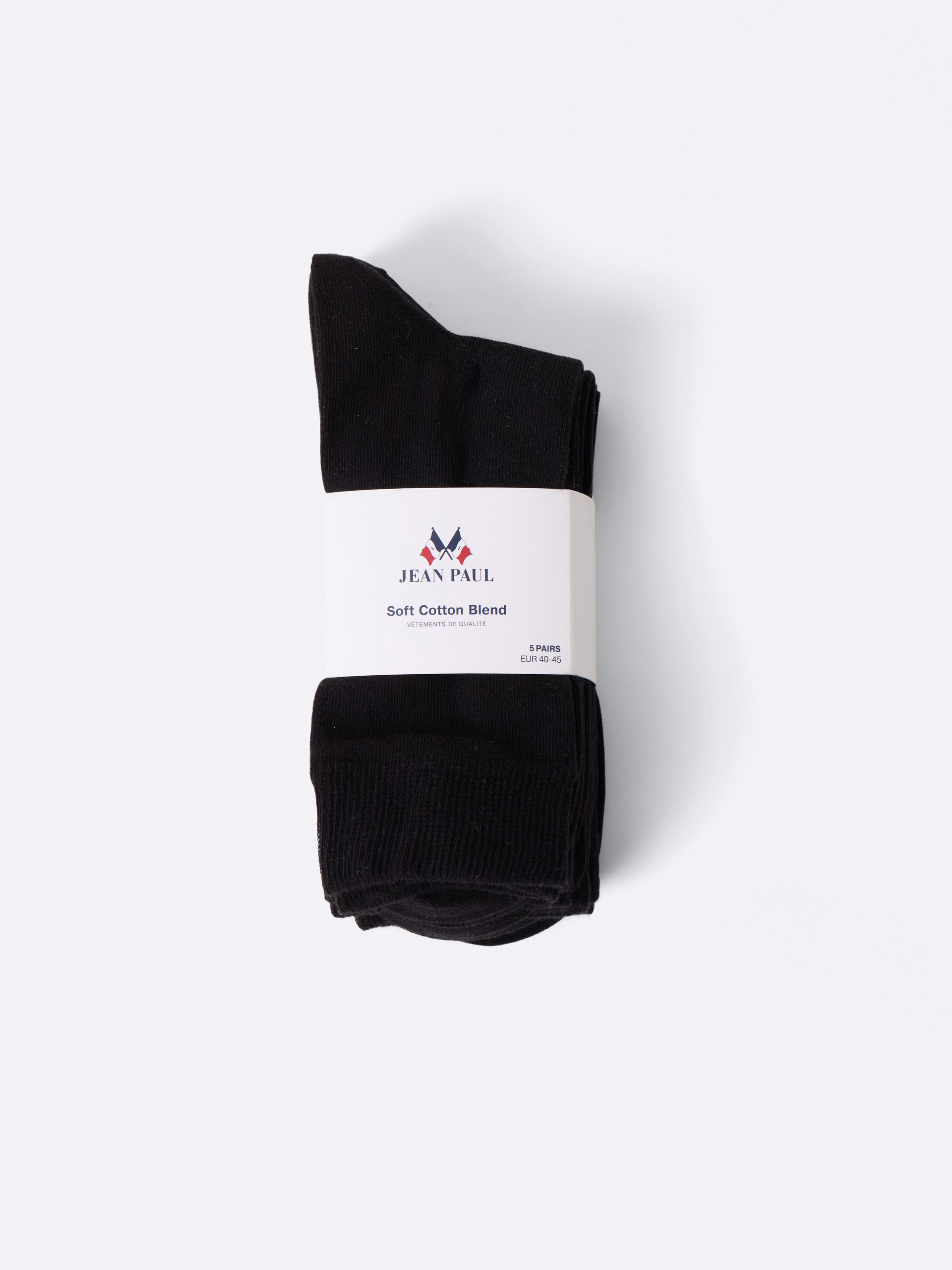 5 pk ensfargede herresokker i komfortabel bomullsblanding med logo og størrelse under foten. Ribkant og god passform