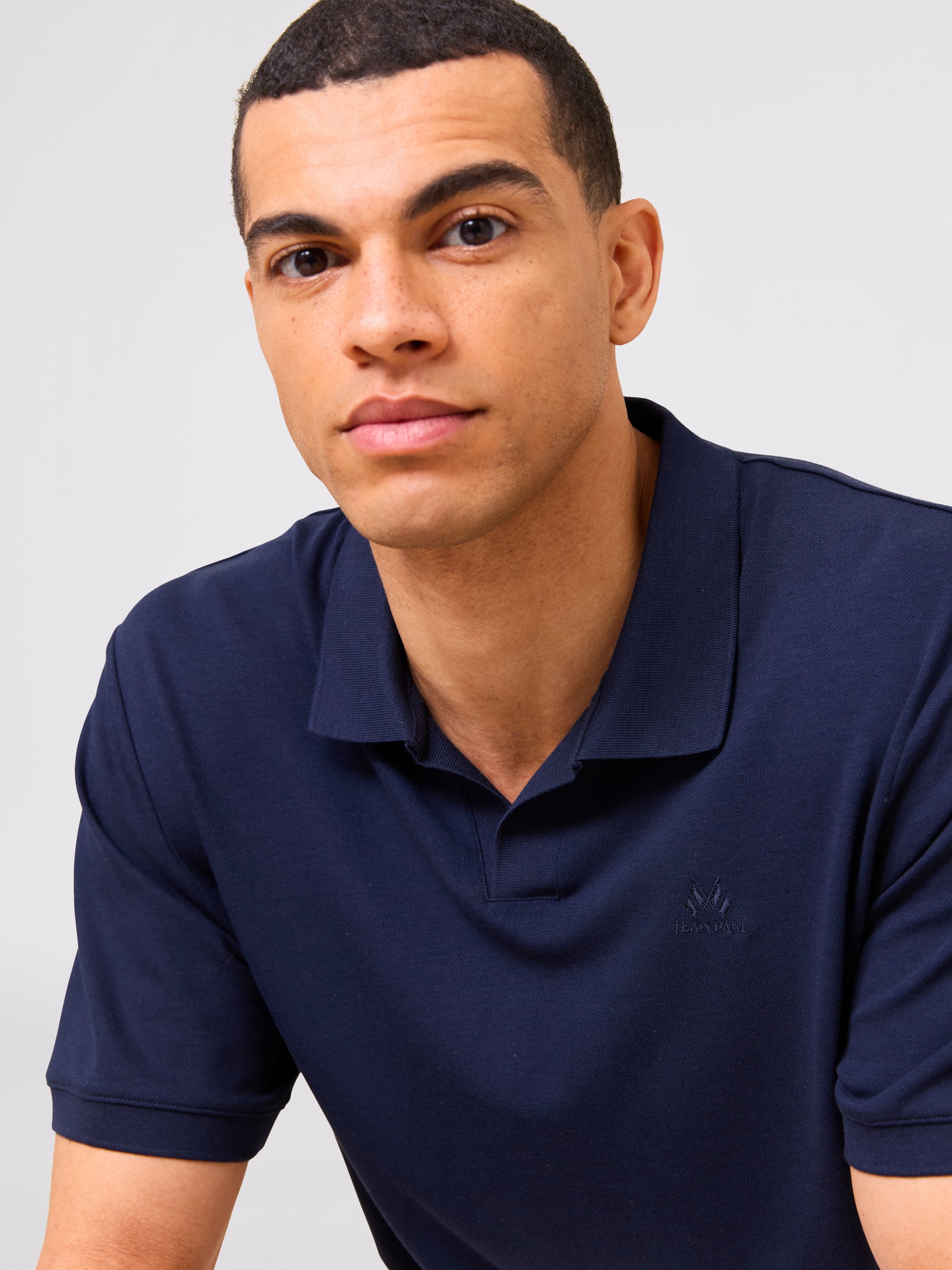 V-ringet pique trøye i lett kvalitet av viskose og bomull med god stretch. Piquettrøyen har diskret ton i ton broderi på brystet, kort erm med ribkant, ribkrage og splitter i sidene. Regulær passform.
