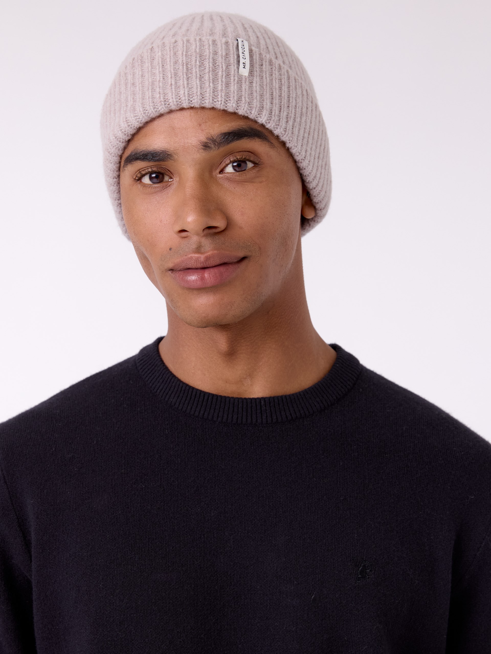 Lue i 100% lammeull. Luen har oppbrett og en liten logobadge.